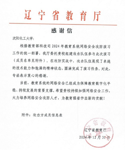 在教育部科技司组织的2024年教育系统网络安全攻防演习中,我校taptap点点官方网站院长王军教授网络安全团队受辽宁省教育厅委托参加此次演习。在攻防实战中,团队展现了卓越的技术能力和饱满的精神状态,圆满完成了演习任务,并收到了辽宁省教育厅的感谢信。