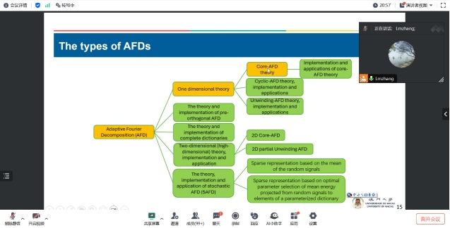报告会上,张立明教授介绍了澳门原创的一种全新的稀疏表示理论——自适应傅立叶分解(AFD),其使用可解释的希尔伯特再生核预定义字典,并通过自适应选择字典中的原子来实现分解。张立明教授分别介绍了Core-AFD、Cyclic-AFD和Unwinding-AFD等多种技术,其中Core-AFD和Cyclic-AFD均为从低频到高频分解方法,但Cyclic-AFD花费时间较多,提取特征也较多,而Unwinding-AFD从高频进行采样分解,收敛速度快。自适应傅立叶分解的核心技术具有一定的稳定性,有潜力挑战并成为新的国际图像和视频压缩标准。此外,也可用于开发基于再生核的深度网络。